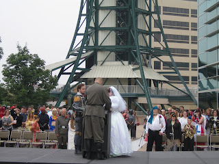 Tamara and I checked to make sure we could get back in before leaving the convention center, then headed for Market Square where we settled on La Costa. My first visit there — the verdict: good food, slow service. After some text messages, I finally got a hold of Rich and got his to-go order. Stuffed, we headed back to the convention center. Our first order of business was finding Tricia and her husband, Dave, in the crowd near the will call booth. While Tamara looked for them, I ran outside to take photos of a Star Wars-themed wedding taking place. I tell you, you haven’t really lived until you’ve seen Boba Fett as the Best Man in a wedding.I went back in and found Tamara, Tricia, and Dave and we headed down to the floor. While Tricia and Dave took in the stars and sites, Tamara and I headed over to Ron Glass’s table. Another autograph fee, another line. I got to his table, shook his hand, and said hi. He asked Tamara and I how we were doing, and we told him we were fine and enjoying the con. I added that my family have been fans of his since his Barney Miller days all the way through to Firefly. While he was signing a photo (another one for me and Rich), I asked if I could take a photo with him; turns out he had the same situation as Mr. Mapother did regarding the Photo Booth. His agent said I could take a photo while he signed the photo. By the time I got my camera ready, he teased me about being late to take the photo. Mr. Glass then went on to tell me and Tamara about a grade-school teacher of his who taught her students, “If you can’t be exact, you’re nothing!” He pounded his fist against the table for emphasis and laughed. I asked if he could hold up the photo he signed and he obliged. We shook hands again and headed off to catch the costume parade upstairs.