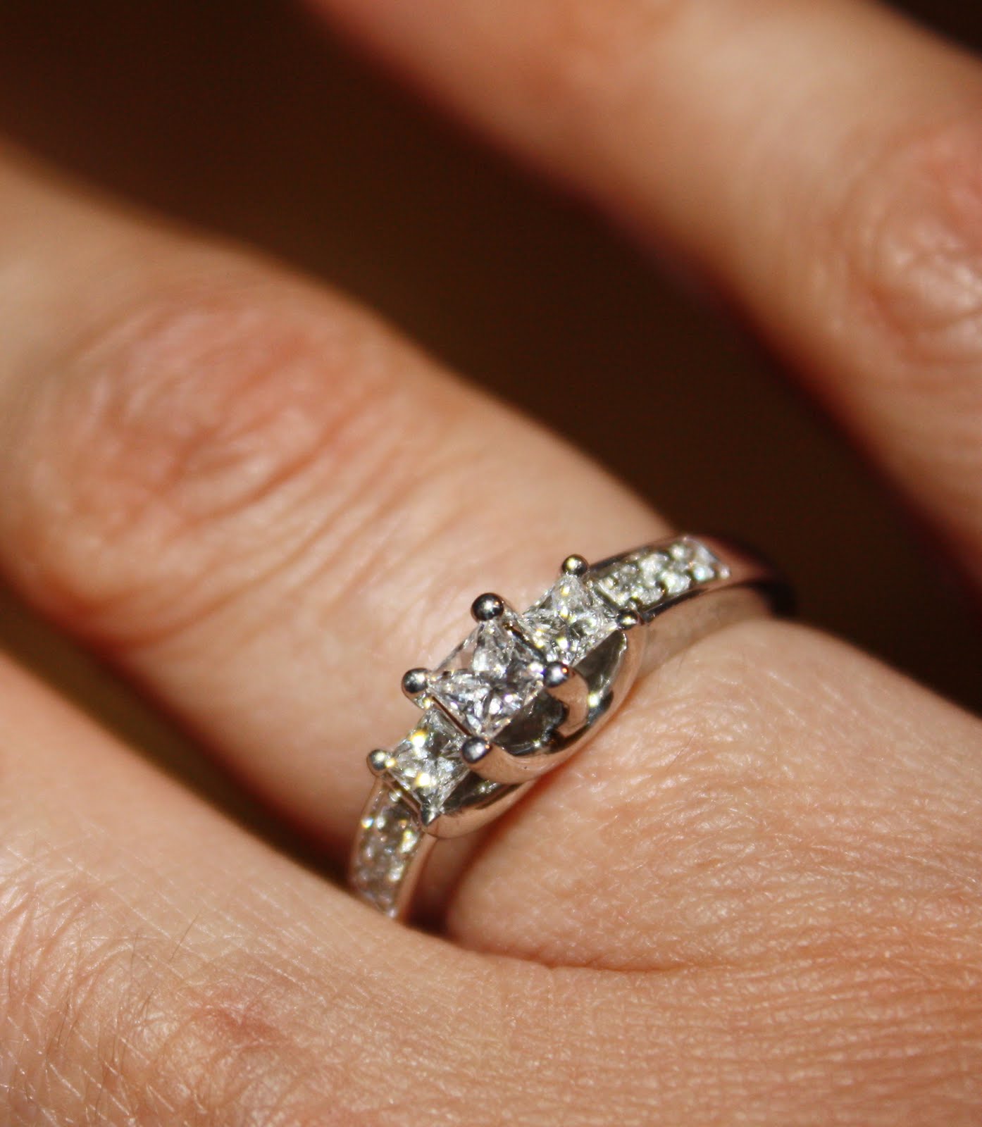 Friday night Rich and I went to Brazeiros Churrascaria, a Brazilian steakhouse that opened a few months ago, to celebrate our 11th wedding anniversary. Talk about eating your fill. The concept is basically that you have a little circle card, one side red, one side green, and you flip it over to get started. Once you have it green side up, you can start with the unlimited salad bar. Then sides are brought to you: carmelized bananas, cheese bread, garlic mashed potatoes, and crispy polenta. The real fun begins when they start bringing the meat. Good lord, the meat. Brought out by gaucho chefs, there are about a dozen different types of meat, ranging from leg of lamb to sausage to sirloin to filet mignon to chicken breast wrapped in bacon — lots of meat. You turn the card back over so it’s red side up when you need a break or, in my case, fear you might vomit from eating so much. Seriously — I ate for almost an hour straight. I’m still full and it’s three days later. I really think I ate my own weight in meat. You get the drift. Aside from a great restaurant experience and a wonderful date night with the hubby, I got my belated 10th anniversary gift, to boot. Behold my anniversary ring: