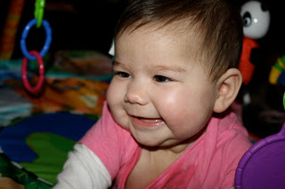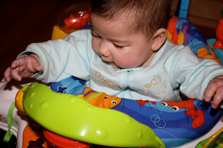She looked better yesterday morning when we woke her up. When I called my mom, who keeps Coraline while we’re at work, to check up on her, the news was good: Coraline had a normal temperature, hadn’t vomited, was playing with her toys, and was trying to watch TV (she is my daughter, after all). Last night at home went pretty well, with her even feeling up to doing her best jumping bean impression in her exersaucer. Here’s hoping she finishes kicking this bug to the curb soon.