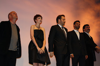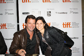 I managed to find out where the celebrities in town for the festival pass their time (i.e., not mingling with us hoi polloi); I’m going to try to venture in that direction over the next couple of days, when I go souvenir shopping. The only times I’ve seen celebrities so far have been when they’re walking the red carpet on the way into a premiere, during Q&A discussions after movies, and on their way out into a waiting car after the movie. That said, I was in the front row for the David Duchovny/Demi Moore movie The Joneses yesterday and managed to get to the stage immediately after the Q&A, where I got Mr. Duchovny’s attention and told him how I enjoyed the movie and what a big fan of his I am. He shook my hand and thanked me. I TOUCHED AGENT MULDER. I honestly thought I might piddle afterwards, I was so giddy having met him. And, yes — he looks absolutely gorgeous up close. I also got within two feet of George Clooney the other day and got photos of Colin Farrell as I passed him on the way into Triage. I also met and got photos with the lovely and gracious Alex Van Sprang and Stefano DiMatteo from George A. Romero’s Survival of the Dead. DiMatteo even teased me and Suzanne with a line from the movie, holding up both his hands and saying, “Five minutes and I change change your lives forever.” And after Daybreakers the other night, Sanjay not only introduced me to and photographed me with the Australian identical-twin directors, Michael and Peter Spierig brothers, but got them to autograph a mini-poster of the movie for me, too. (Thanks again, Sanjay!)